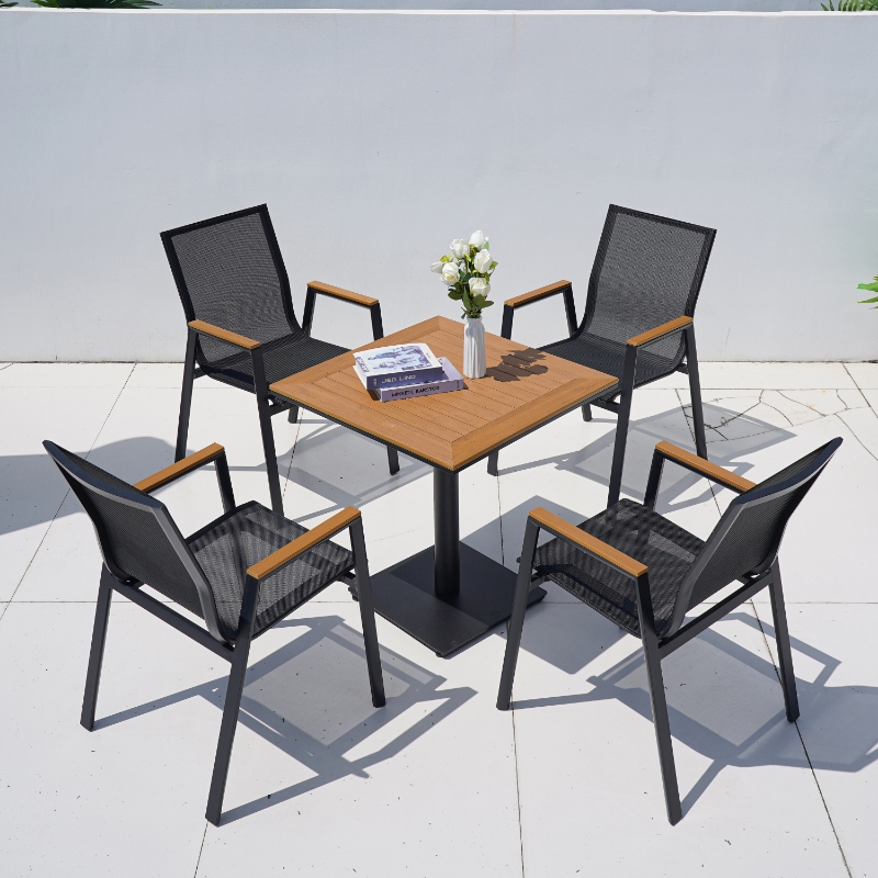This set includes 1 square dining table measuring 90×90×76cm and 4 spacious chairs sized 55×65×82cm. The chairs are crafted with a sturdy aluminium frame, wrapped in breathable and UV-resistant synthetic Teslin fabric, ensuring year-round comfort and performance. Designed for practicality, the chairs are fully stackable, allowing for easy storage and space-saving convenience.