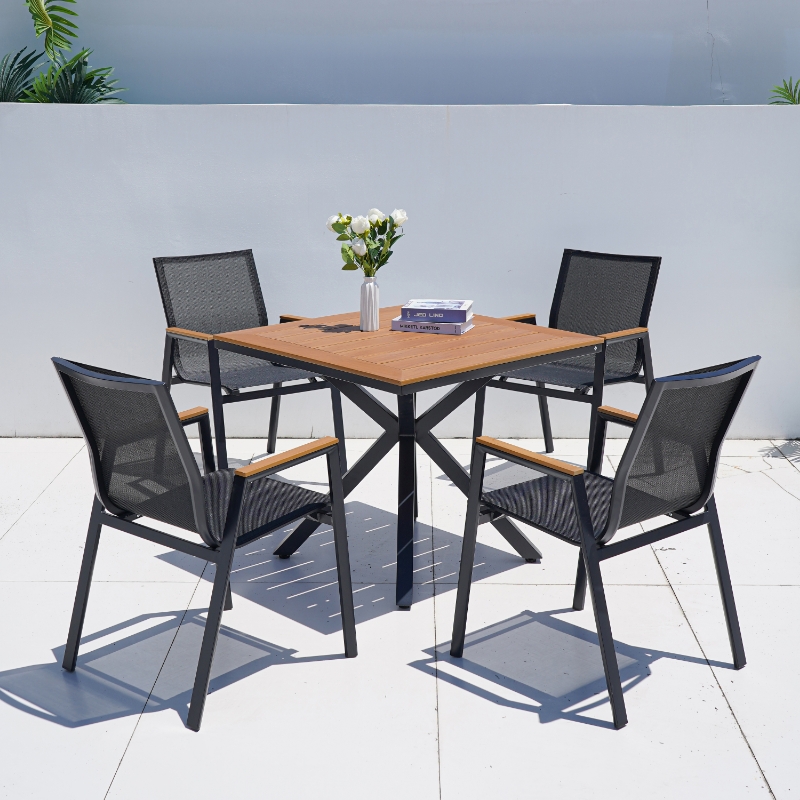 The square dining table boasts an iron top with artificial poly wood slats that mimic the rich texture of real timber without the upkeep. This dismantlable table allows for easy assembly, transport, and installation across any environment.