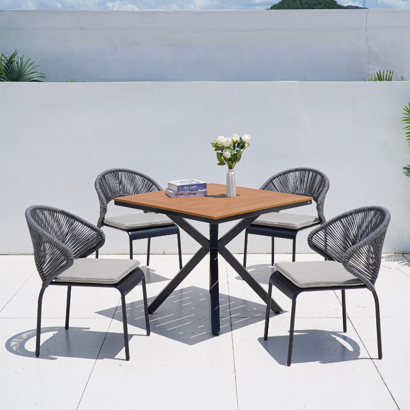 Introducing the Madona Outdoor Square Dining Set, a beautifully crafted fusion of sophistication, durability, and comfort. Made in China with meticulous craftsmanship, this 5-piece dining set is designed to elevate any space—be it a cozy balcony, a breezy terrace, a serene poolside, or the heart of your indoor or outdoor restaurant. This set seamlessly blends into both commercial and residential environments and is loved by hospitality projects, exotic lounges, and high-end cafés around the world.