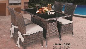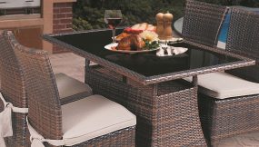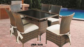 A royal and modern looking sunperry outdoor dining set with rectangular table having dark tempered glass top made from synthetic rattan with aluminum frame. Water resistant chair cushions add to its beauty. Option to add two extra chairs is available.Sunperry outdoor dining sets are the most recommended